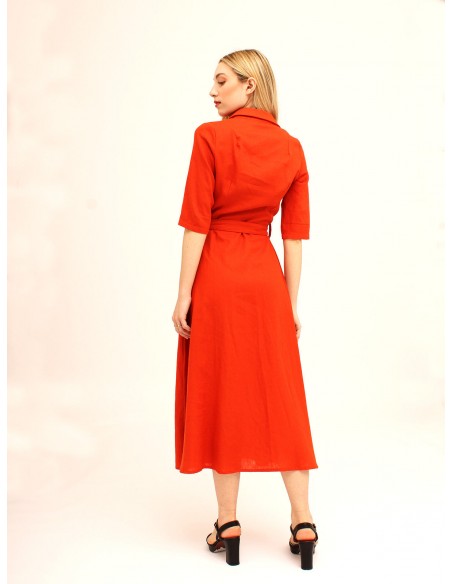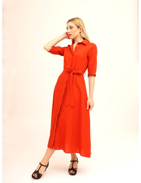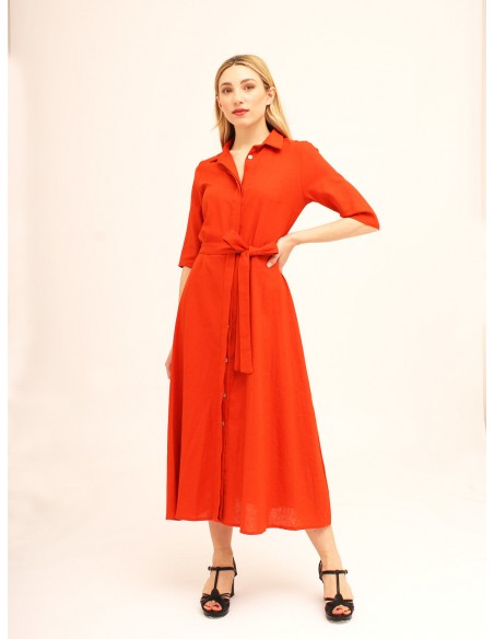 BASTAHAbito lungo in lino rosso con manica a 3/4. Abbottonatura sul davanti con bottoni in madreperla, gonna svasata e cintura in vita. Made in Italy.