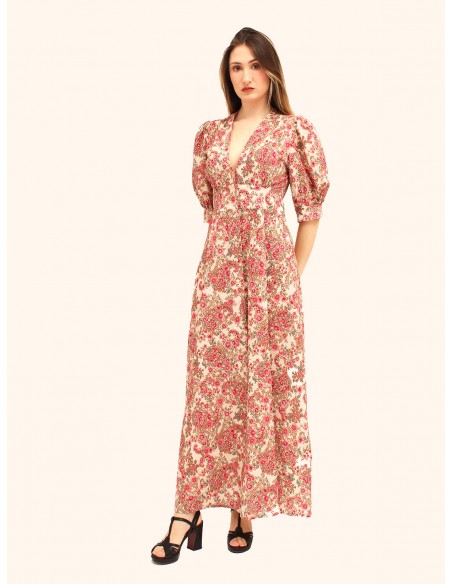 MOMONIAbito lungo fantasia floreale rosa Momoni’ con gonna svasata. Scollo a V, abbottonatura sul davanti con bottoni in madreperla, maniche a palloncino lunghezza 3/4.