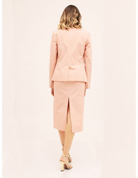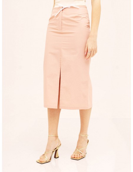 HACHEGonna midi rosa con spacco frontale e sul dietro, le pinces orizzontali sui fianchi garantiscono una vestibilitá slim perfetta. Chiusura frontale con laccino regolabile.