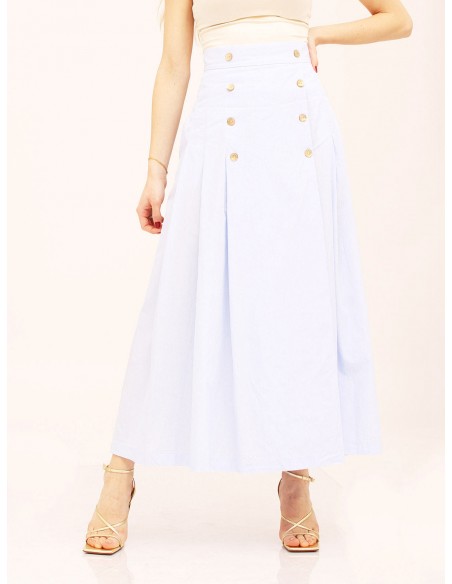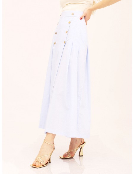 ALESSIA SANTIGonna pantalone celeste in puro cotone con dettaglio pinces sia sul davanti che sul retro. Tasche inserite lungo i fianchi, zip invisibile sul fianco sinistro. Il capo é impreziosito da bottoni personalizzati sul davanti. Vestibilitá over.