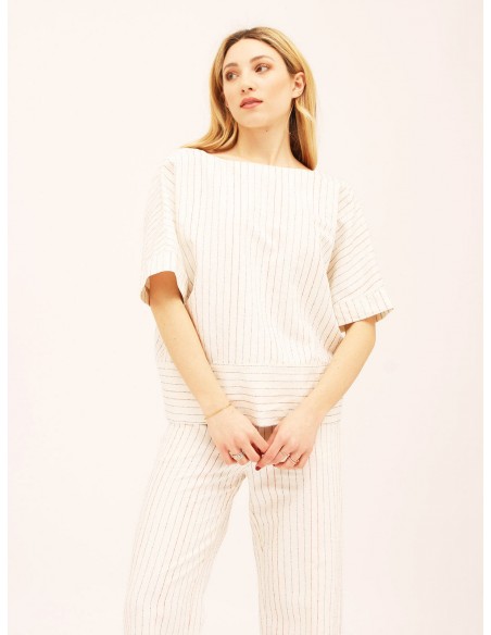 ALESSIA SANTICamicia over in misto lino e cotone, motivo a righe blu e rosse. Manica corta, scollo a V. Vestibilitá over.