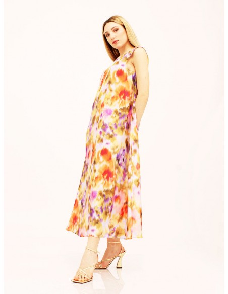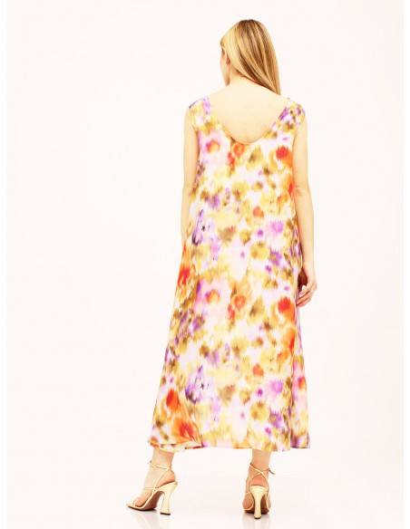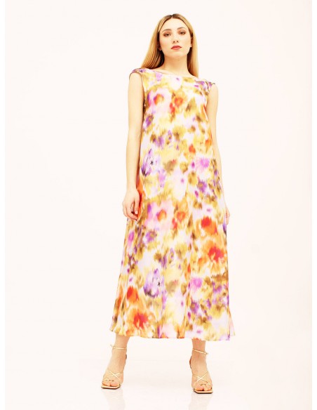 MOMONIAbito lungo smanicato multicolor in pura seta stampata dalla linea svasata e morbida. Lo scollo a barca sul davanti si apre in una “V” sulla schiena. Made in Italy.