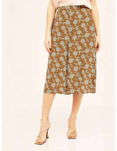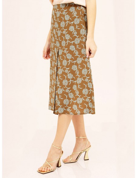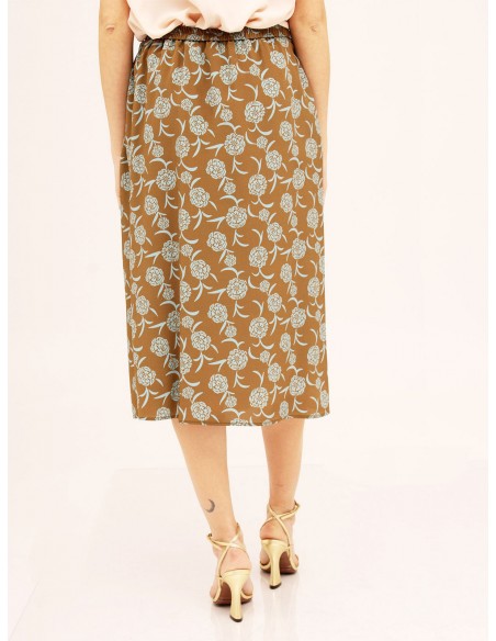 MOMONIGonna midi in seta stampata tabacco/azzurro, col elastico sul dietro e tasche inserite lungo i fianchi. Linea svasata con sfondopiega sul davanti. Made in Italy.