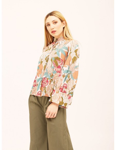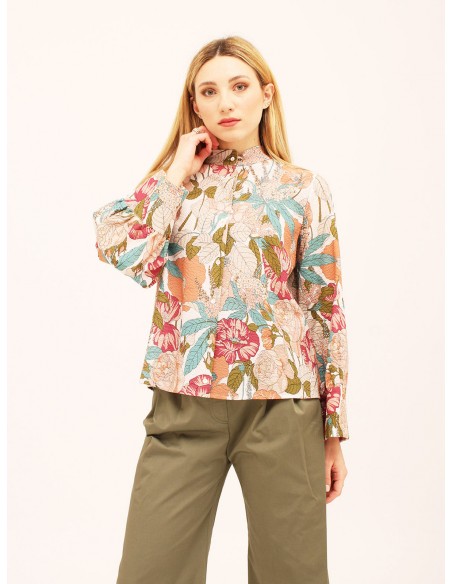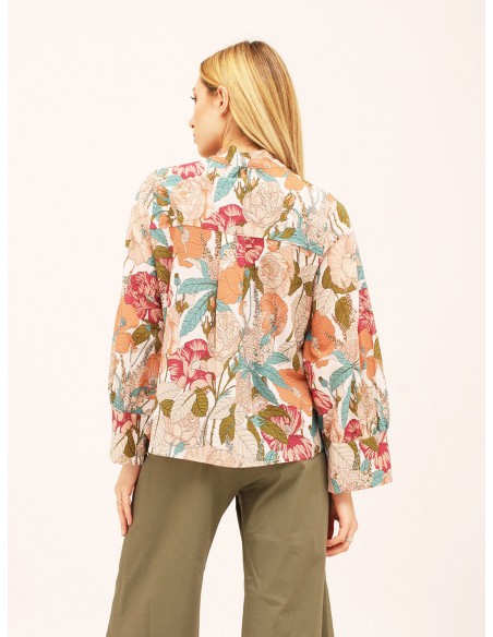 MOMONICamicia fantasia floreale in puro cotone con abbottonatura sul davanti e colletto alla coreana. Vestibilitá over con maniche larghe stile kimono. Made in Italy.